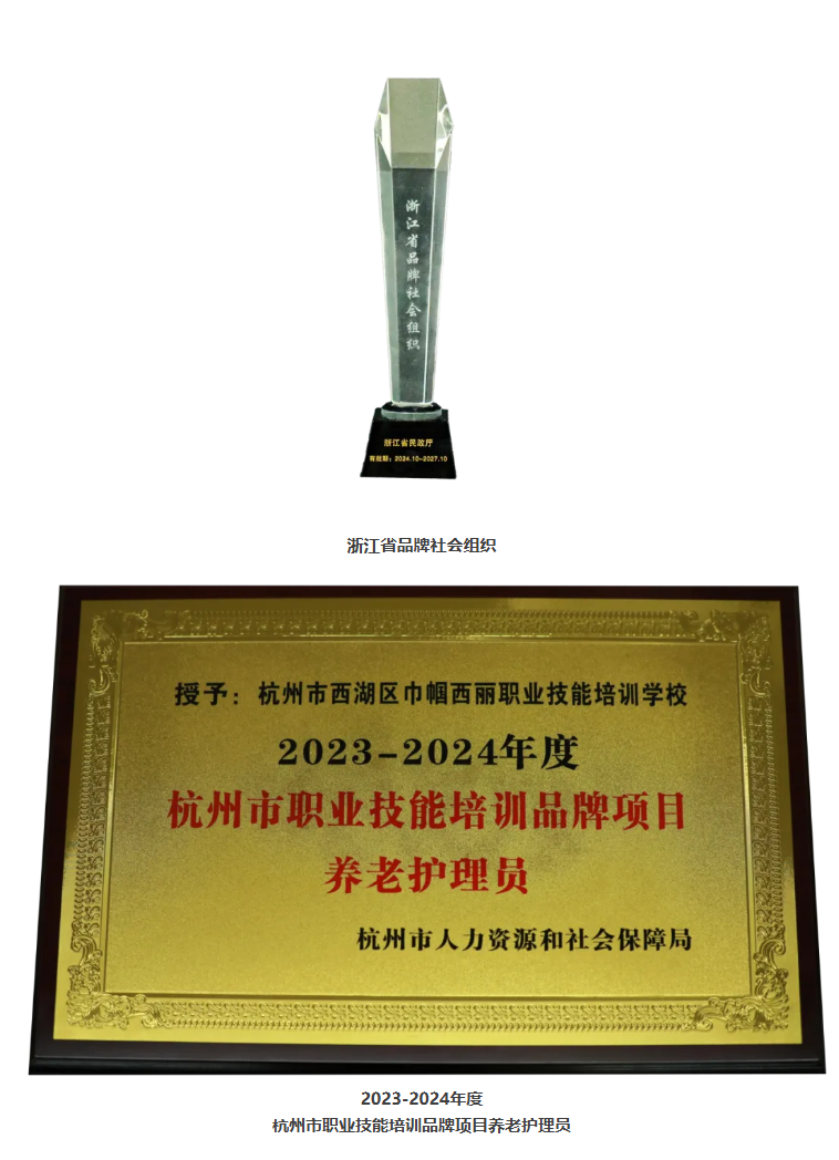 近日,巾幗西麗職業(yè)技能培訓(xùn)學(xué)校先后榮獲浙江省民政廳頒發(fā)的 “浙江省品牌社會組織” 稱號及杭州市人力資源和社會保障局頒發(fā)的 “2023 - 2024 年度杭州市職業(yè)技能培訓(xùn)品牌項(xiàng)目養(yǎng)老護(hù)理員” 稱號。